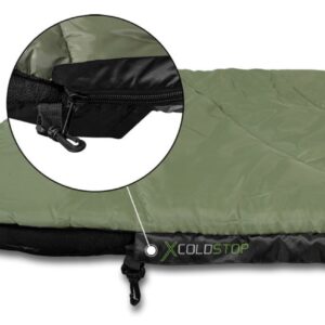 Do wnętrza śpiwora dostaniesz się z obu stron, ponieważ posiada on zamki błyskawiczne z prawej i lewej strony. Dzięki temu będziesz mógł ustawić swoje łóżko wędkarskie po dowolnej stronie namiotu i szybko z niego wyskoczyć gdy usłyszysz alarm brania. Przegroda zamka błyskawicznego COLDSTOP po obu stronach zapobiega przedostawaniu się zimnego powietrza do wnętrza śpiworu. Dodatkowo, zamki błyskawiczne są wyposażone w plastikowy klips po każdej stronie, aby łatwiej było je rozsuwać i zasuwać.