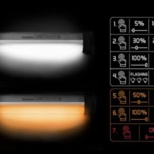Delphin LightBAR to bardzo praktyczna lampka do namiotu, dzięki której ciemność już Cię nie zaskoczy. Ma dwa kolory, każdy z kilkoma poziomami oświetlenia. Po pierwszym naciśnięciu włącza się białe światło o jasności 5%. Drugie naciśnięcie oświetla do 30%, a trzecie naciśnięcie włącza białe światło do 100%. Po czwartym naciśnięciu białe światło miga, co docenisz np. przy wypłynięciu na duże zbiorniki wodne, dzięki czemu będziesz w stanie wyraźnie określić, gdzie na brzegu znajduje się Twój obóz.
